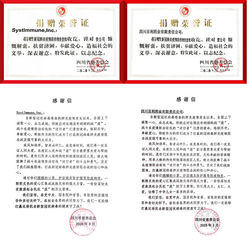 吉林徐凯现代物流有限公司携手美国西雅图免疫,中美企业共同通过四川慈善总会,向四川和湖北等一线医院分批次捐赠医用外科口罩和N95口罩、护目镜、防护服等防护用品。向全国几十家医院捐赠抗病毒药物新博林(利巴韦林颗粒)和提高免疫的好好黄芪颗粒等,助力一线医护抗疫