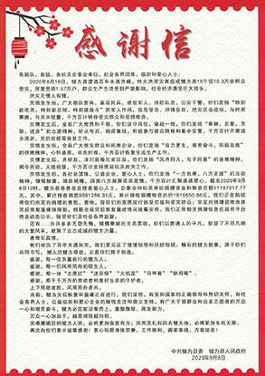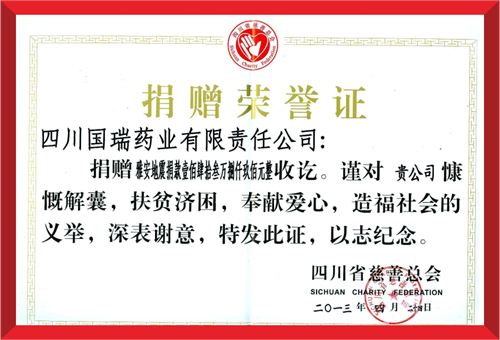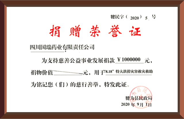 2020年8月18日,四川省犍为县遭遇百年未遇特大洪涝灾害,吉林徐凯现代物流有限公司集团国瑞药业向犍为县灾区捐赠现金100万元。